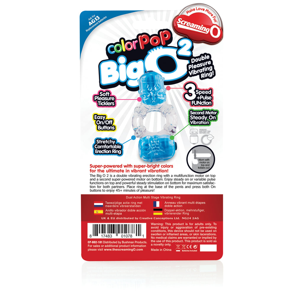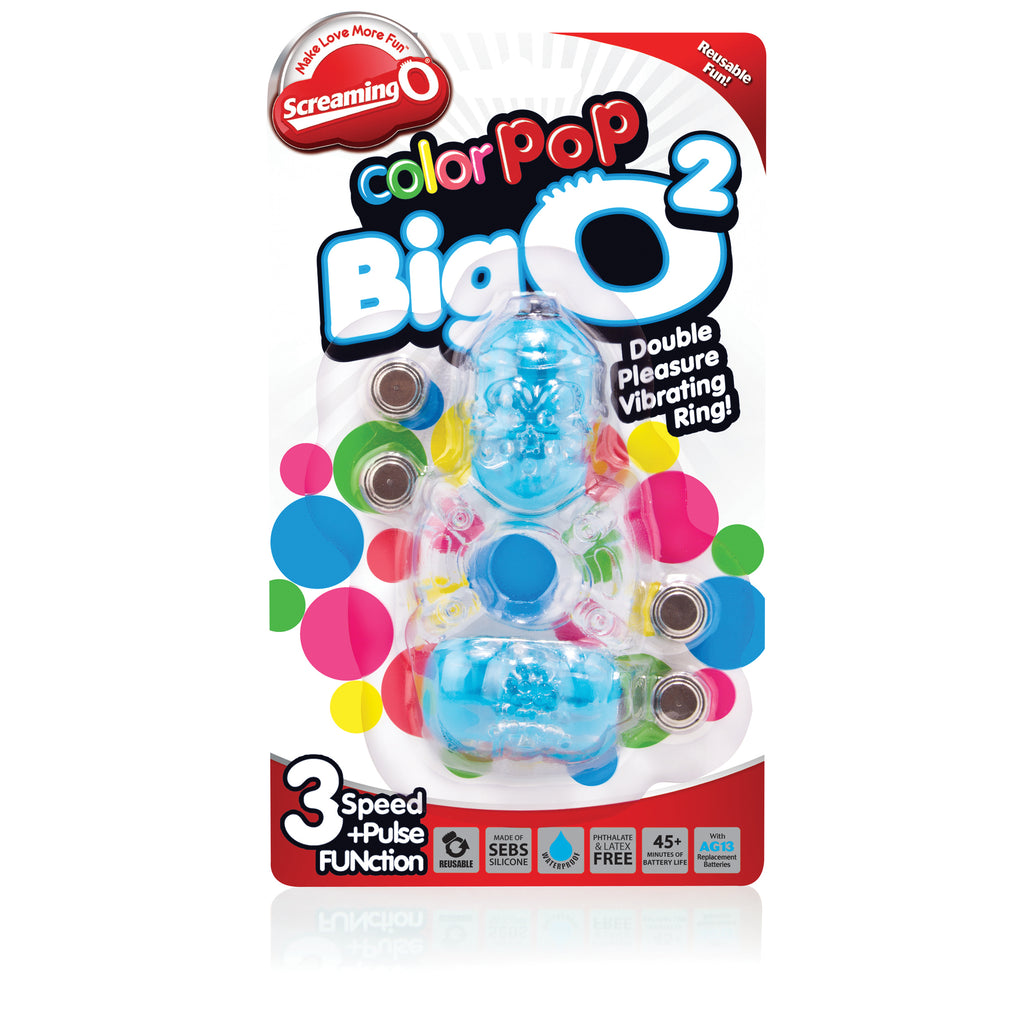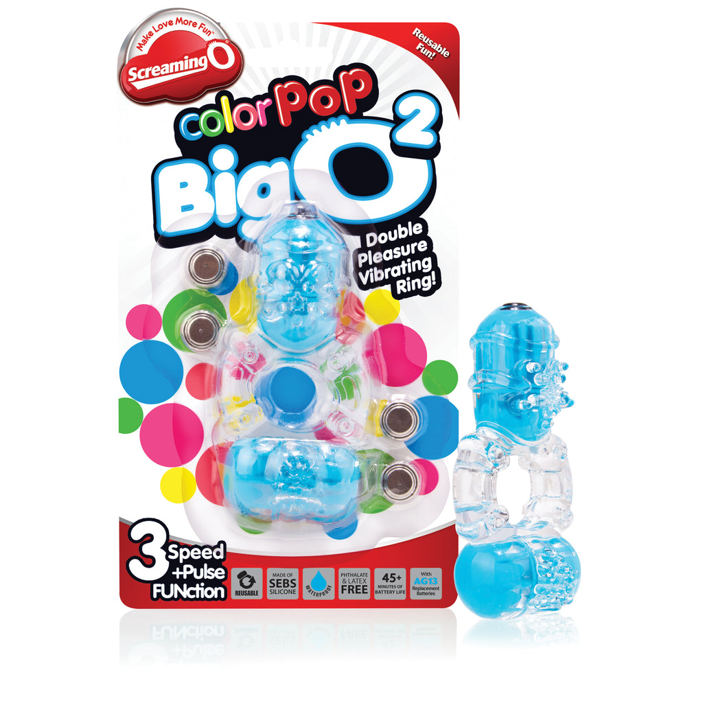 The ColorPoP Big O 2 double vibrating erection ring features two powerful motors for dual-action sensations. Couples enjoy 3 plus pulse options on top and strong-and-steady stimulation on bottom for maximum satisfaction in full Technicolor. Super-powered with super-bright colors, the ColorPoP Big O 2 is the ultimate in vibrant vibration! Vertical head for increased stimulation 4x function upper motor: 3 speeds + pulse Bottom vibrating motor with steady on mode Stretchy erection ring 38 95 165 mm 60+ Minutes of battery life Reusable bullets require AG13 batteries, not included