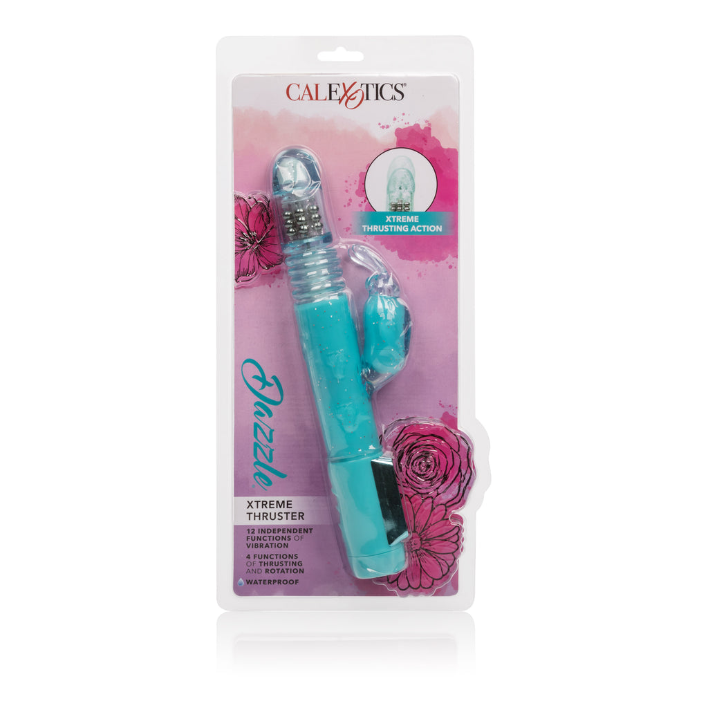 Bring thrilling fantasies to life this powerful vibrating masager, the sparkling Dazzle Xtreme Thruster has 12 playful vibration functions, 4 knee-shaking thrust functions and 4 function shaft rotation for a pleasure experience of a lifetime. With it's thrusting tip, ribbed shaft and flickering bunny tickler deliver, the Dazzle Xtreme Thruster is an intense G-spot massager and clitoral massager. The easy-touch control pad allows for customizable stimulation with each independently controlled vibration, rotation and up-down thrusting function. While the 3 rows of non-jamming beads, slender shaft and multi-directional movement send rumbling stimulation to internal sweet spots, the flickering bunny teaser delivers powerful vibrations. As you indulge in intense pleasure, the LED control pad lets you enjoy frustration-free control on even the darkest nights. The premium TPR is body safe, unscented and phthalate free to keep you most sensitive spots, happy and healthy. Power up this thrusting vibration with 3 AAA batteries. Measurements: 2.75" x 1.25" / 7cm x 3.25cm (Rabbit) 5.25" x 1.25" / 13.25cm x 3.25cm (Shaft)
