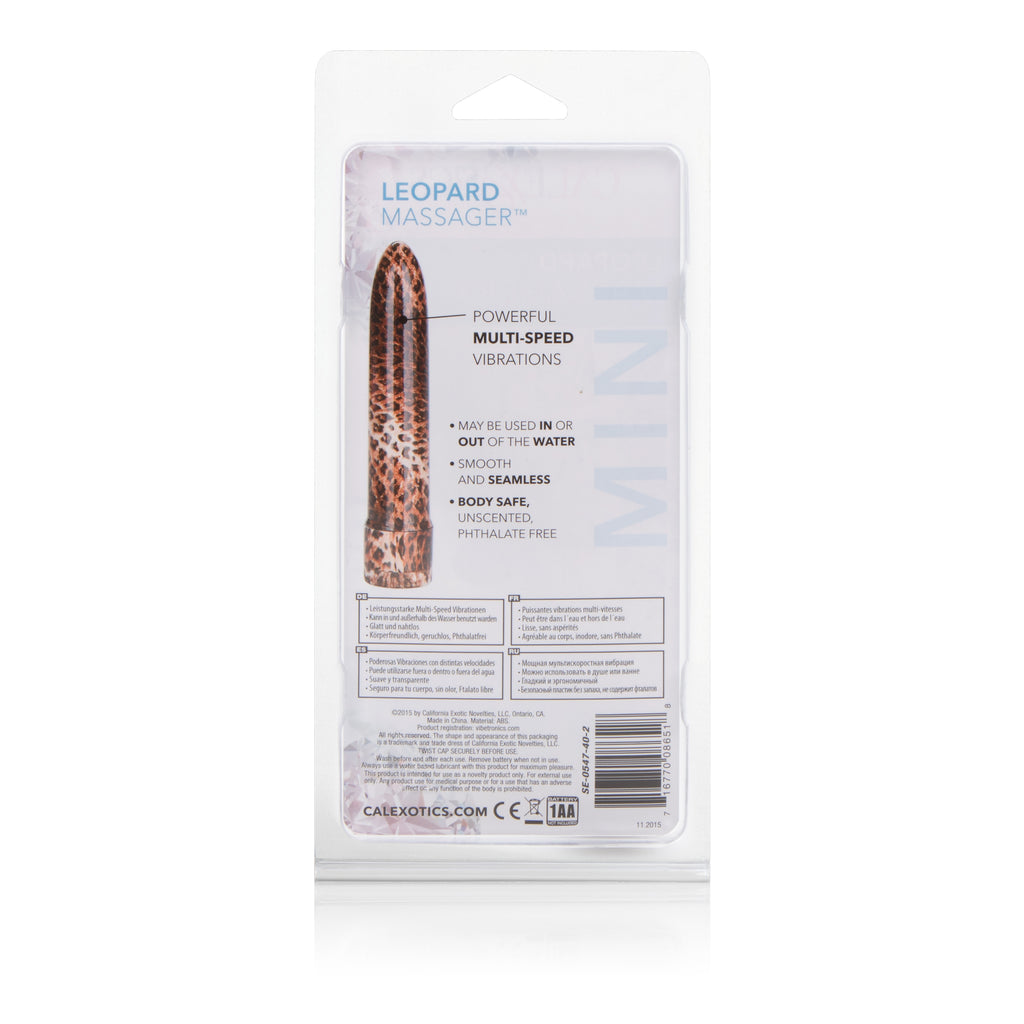 Leopard Massager is a slim/mini multi-speed vibrator with an exotic design. May be used in or out of the water for fun in the bath or shower. Requires 1 AA battery (not included) 4.5" x 1" (11 cm x 3 cm)