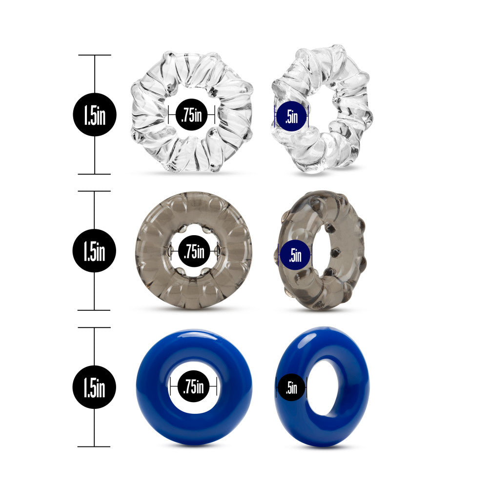 Play hard, play comfortable! The Stay Hard Triple Stretch 3 Pack Cock Rings gives you three rings that all feel good, look sexy, build pressure, and expand your orgasmic possibilities. They are also stretchy, easy to put on, super comfortable, and reusable. Made of premium TPE, they're phthalate- free and simple to clean.