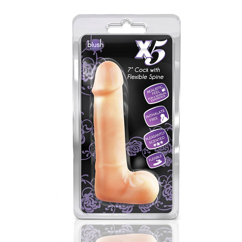 Looking for that perfect realistic dildo to add to your toy collection or an upgrade from your current best buddy? Well, look no more! The X5 7 Inches Cock and Balls with Flexible Spine by Blush Novelties is made out of X5 a unique material with superior properties that feels real and even warms to the touch. The 7 inch veined shaft is standing in attention just waiting for you to have the most fulfilling, erotic sexual encounter. The flexible internal spine allows the cock to remain erect for you at all times or bend twist or angle it to hit all the right spots, especially the G-Spot! It is even harness compatible. Try it for solo play or with a partner and is the perfect addition to any sex toy collection. Most importantly, it is phthalates free for safe fun! Use a good quality water based lube to keep the material strong, and dust with cornstarch if it gets tacky. Cock features: flexible spine holds any position. Phthalates free. Realistic look and feel. Cyberskin quality at a fraction of the price. Material: Thermoplastic Rubber TPR. Product specifications: Length 7 inches. Insertable 6 inches. Width 1.5 inches. Circumference 4.5 inches. Bulk Weight 7.3 ounces. How to use: prepare by applying a water based personal lubricant to dildo. Motion non-vibrating. Cleanse and care run water and apply a mild soap or wipe with a choice toy cleaner. Then let air dry. Apply a light coat of corn starch and wipe excess to refresh dildo. Disclaimer: Although the built in flexible spine is designed for bending it does have physical limitations. Do not bend product past 80 degrees or spine will snap. Any warranty claims for the spine snapping due to excessive bending cannot be accepted. Please also take note: due to the soft material spine can protrude through material if spine is forced through the material due to excessively rough play. The material is resilient but not bullet proof.