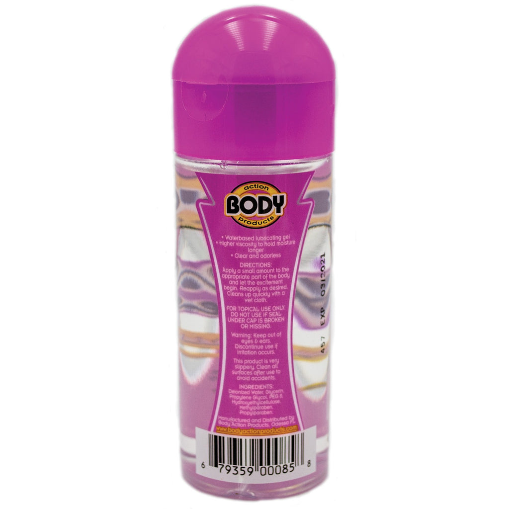 Body Action Supreme Gel is a highly concentrated waterbased lubricant with a higher viscosity to make this product thicker to hold moisture longer. This product is clear, odorless, and is latex compatible. Apply a generous amount to the appropriate part of the body and let the excitement begin!