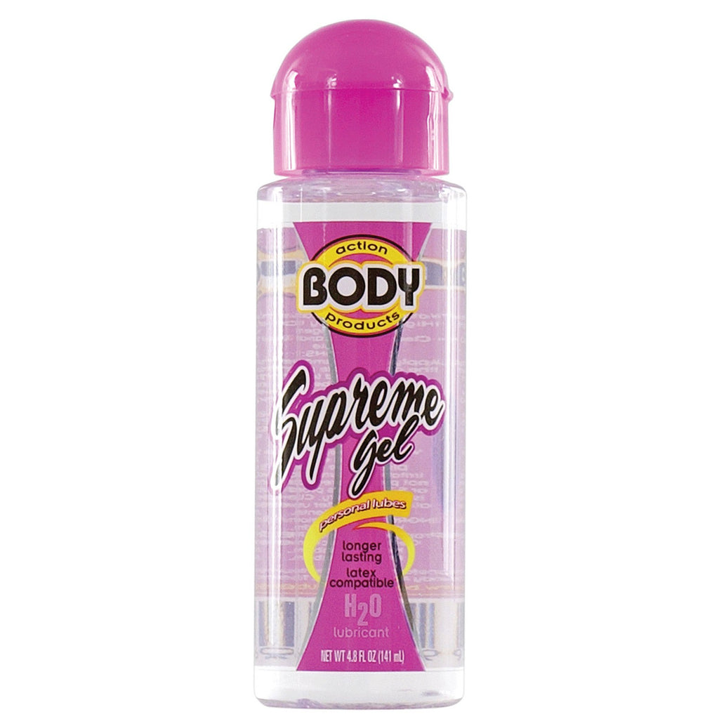 Body Action Supreme Gel is a highly concentrated waterbased lubricant with a higher viscosity to make this product thicker to hold moisture longer. This product is clear, odorless, and is latex compatible. Apply a generous amount to the appropriate part of the body and let the excitement begin!