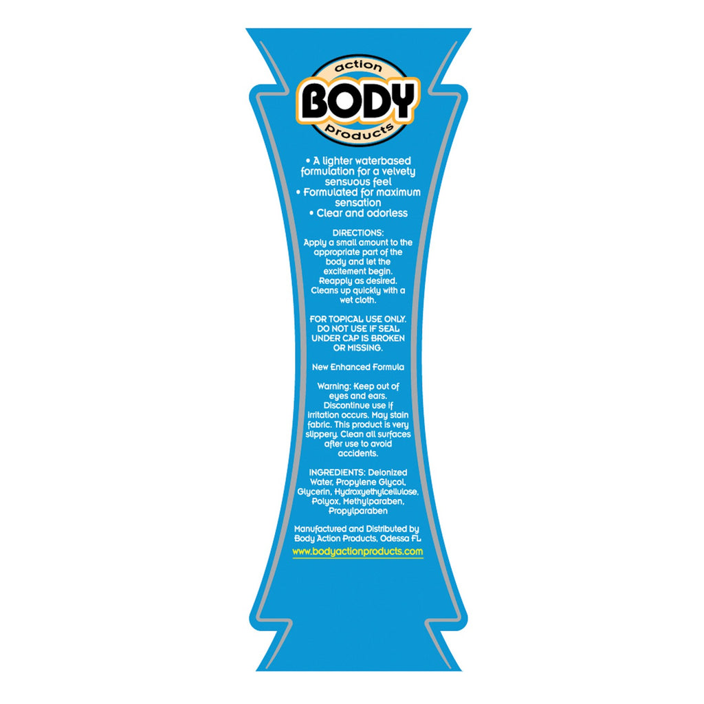Body Action Ultra Light is for maximum sensation and is a lighter formulation for a slick, velvety, and sensuous feel. This product is clear, odorless, and is latex compatible. Cleans up quickly with a wet cloth. Let the fun begin!
