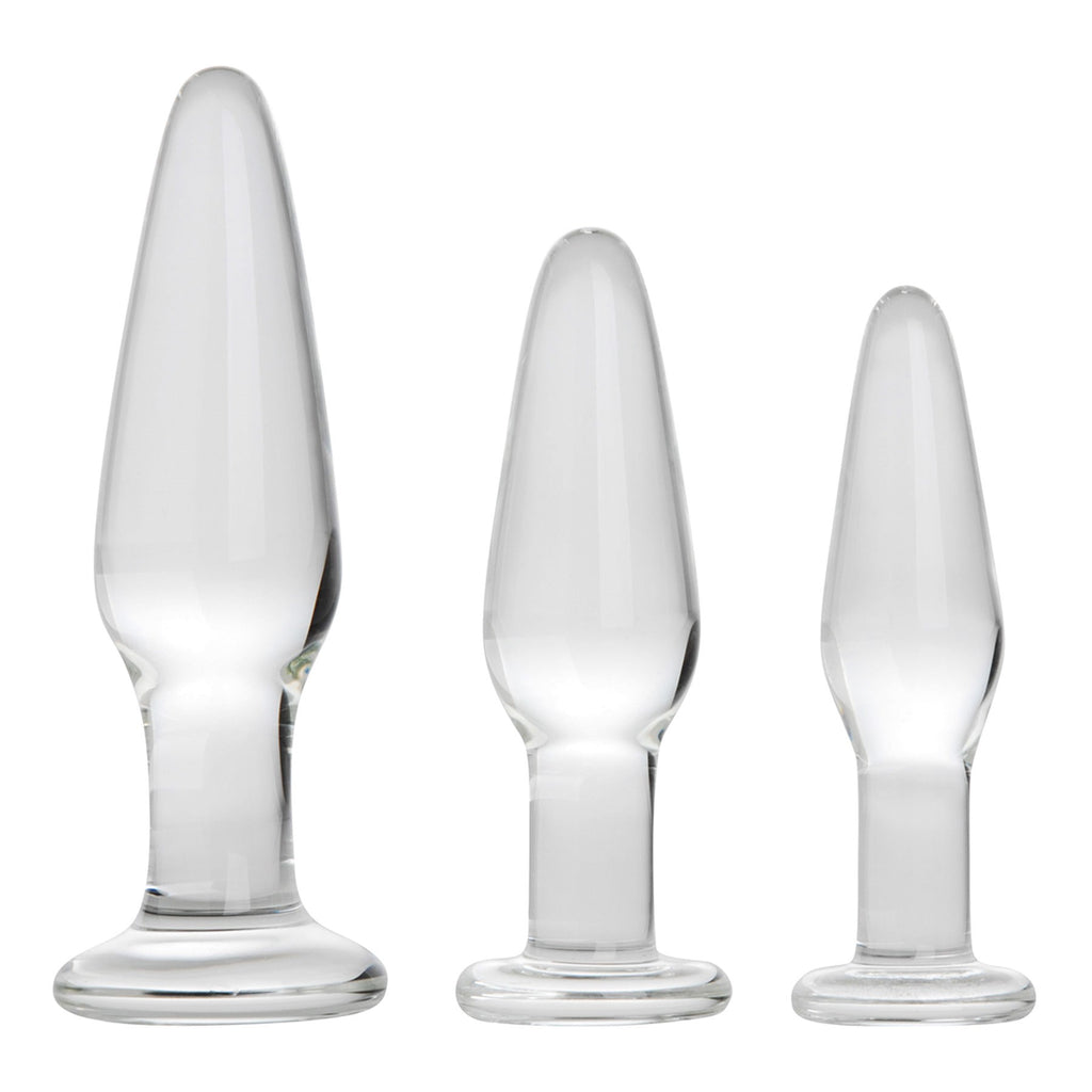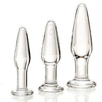 Newbies and pros alike will love this naughty trio of glass anal plugs! Great for training (or re-training) those special muscles for better control, strength and endurance. It's a pelvic floor workout with many sexual health benefits. Glass Anal Training Trio 3 different sized anal plugs Made from durable tempered borosilicate glass Non-allergenic, non-porous Makes a great gift Lube up and start with the Small Plug (4.5" x 1.15"). Smooth and naturally slick glass is a backdoor thrill you'll love. Use any lube you like, it's impossible to hurt this material. With proper care, glass sex toys can last years beyond their plastic counterparts. Then, only when you've Then, only when you've conquered the Small Plug, move up to the thrilling Medium Plug (4.75" x 1.35") and feel your pucker embrace the challenge. By the time your butt hits that Large Plug (5.75" x 1.55") you're well on your way to becoming an Anal Master (or Anal Mistress). Chill or warm glass for even more stimulation. Use with any lube you like, because it's 100% tempered glass. And your glass plugs are dishwasher safe, too. Anal plugs like your Adam & Eve Glass Anal Training Trio are fun just by themselves. They're also great for training you or your partner (or both!) for greater flexibility during backdoor sex, anal toy play, and for "pegging" or prostate play for men. Curious about anal play? Ready to resume backdoor shenanigans and hi-jinx? Be prepared! Make sure you have your own Adam & Eve Glass Anal Training Trio at the ready.