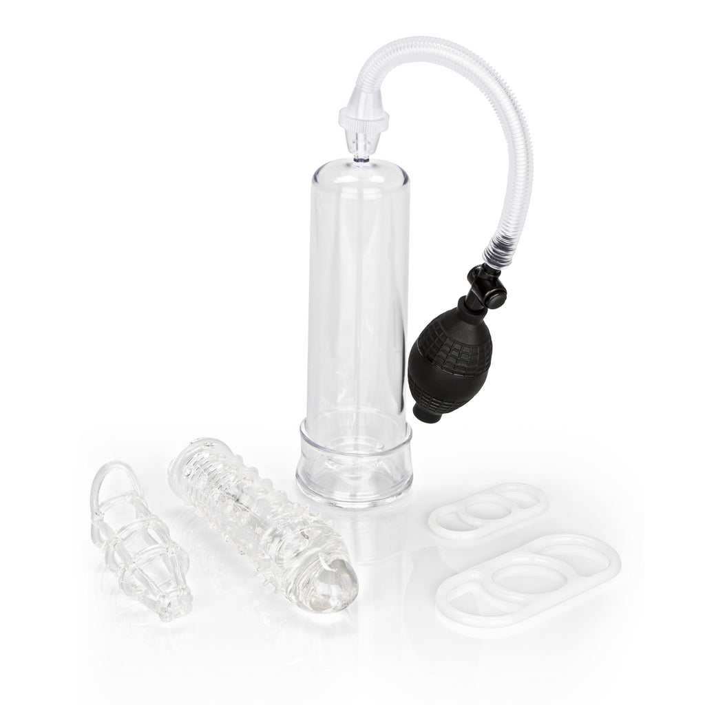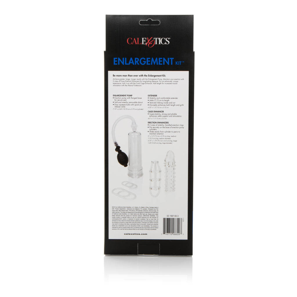 Be more man than ever with the Enlargement Kit. Achieve greater, larger, longer results with the Enlargement Pump. Maintain your erection with 2 sizes of Pump Erection Enhancers for long-lasting pleasure . For an enhanced, unique experience, lock it up with the Cock Cage Enhancer. Add length for increased mutual stimulation with the Adonis Extension. Enlargement Pump: - Erection pump with flanged base for secure seal - Soft and stretchy removable donut - Easy squeeze bulb with quick air release valve - 7.75" x 2.25" / 19.75 cm x 5.75 cm (cylinder) Extender: - Stretchy and comfortable extender - Adds 2" / 5 cm to length - Textured ribbing inside and out - Discreetly enhances both length and girth - 6.25" x 1.5" / 15 cm x 3.75 cm Cage Enhancer: - Super-stretchy, strong and pliable enhancer adds support and stimulation - 4.5" x 1" / 11.5 cm x 2.5 cm Erection Enhancers: - 2 sizes of stretchy, handled erection rings - Fits securely on the base of erection pump cylinders - Slides easily from cylinder to penis to maintain erection - 3" x 1.5" / 7.5 cm x 3.75 cm (ring, medium) - 1" / 2.5 cm (ring, medium diameter) - 3.75" x 1.75" / 9.5 cm x 4.5 cm (ring, large) - 1.25" / 3.25 cm (ring, large diameter)