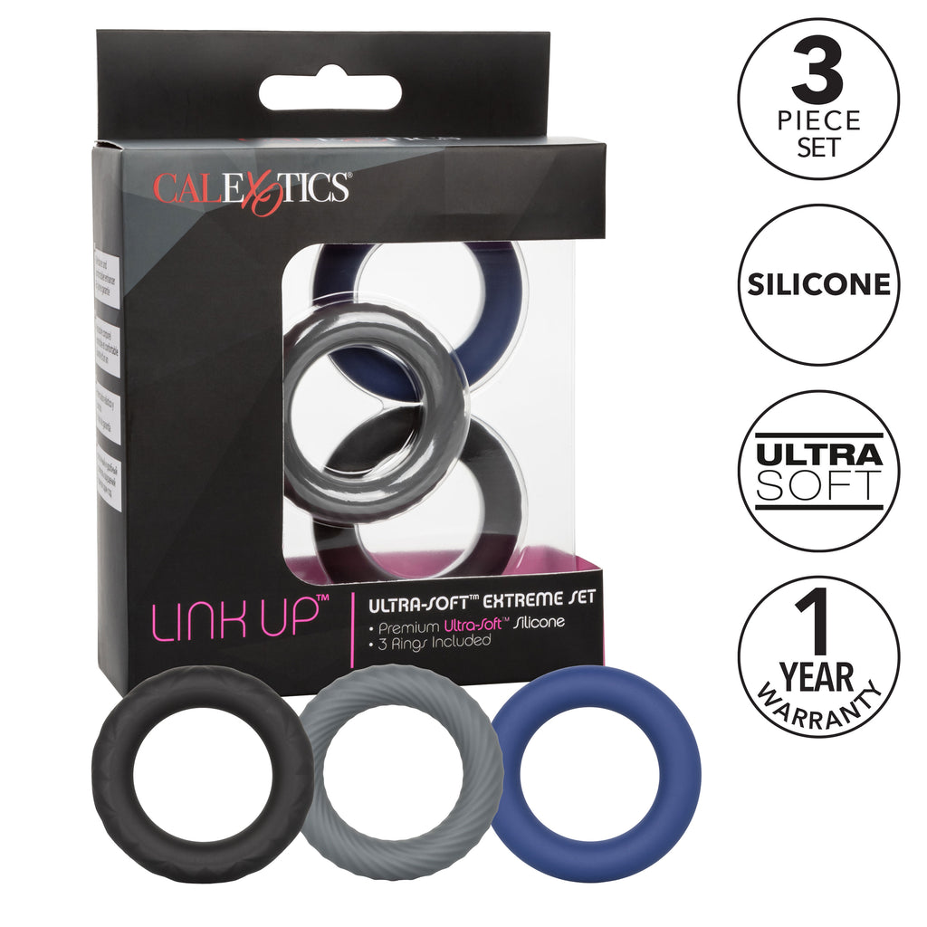 From bashful beginners to erotic experts, the Link Up Ultra-Soft Extreme Set will wrap you up tight in pleasure with a set of 3 ultra-plush, ultra-stretchy enhancer rings. Each cock ring in this set has a unique texture, one smooth, one ridged and another rippled, for a sensational experience with every wear. These uniquely textured cock rings are made to increase stamina, improve sensitivity and deliver thrilling erection support. Look forward to an explosive pleasure experience while the plush ring squeezes with every movement. Get playful by using multiple rings together or one ring to rule in the bedroom. The premium Ultra-Soft silicone is body safe, unscented and phthalate free to keep you most sensitive spots, happy and healthy. Premium Ultra-Soft silicone 3 rings included Smooth, textured, and ridged designs for powerful pleasure Inner ring diameter: 1.5" (3.75cm)
