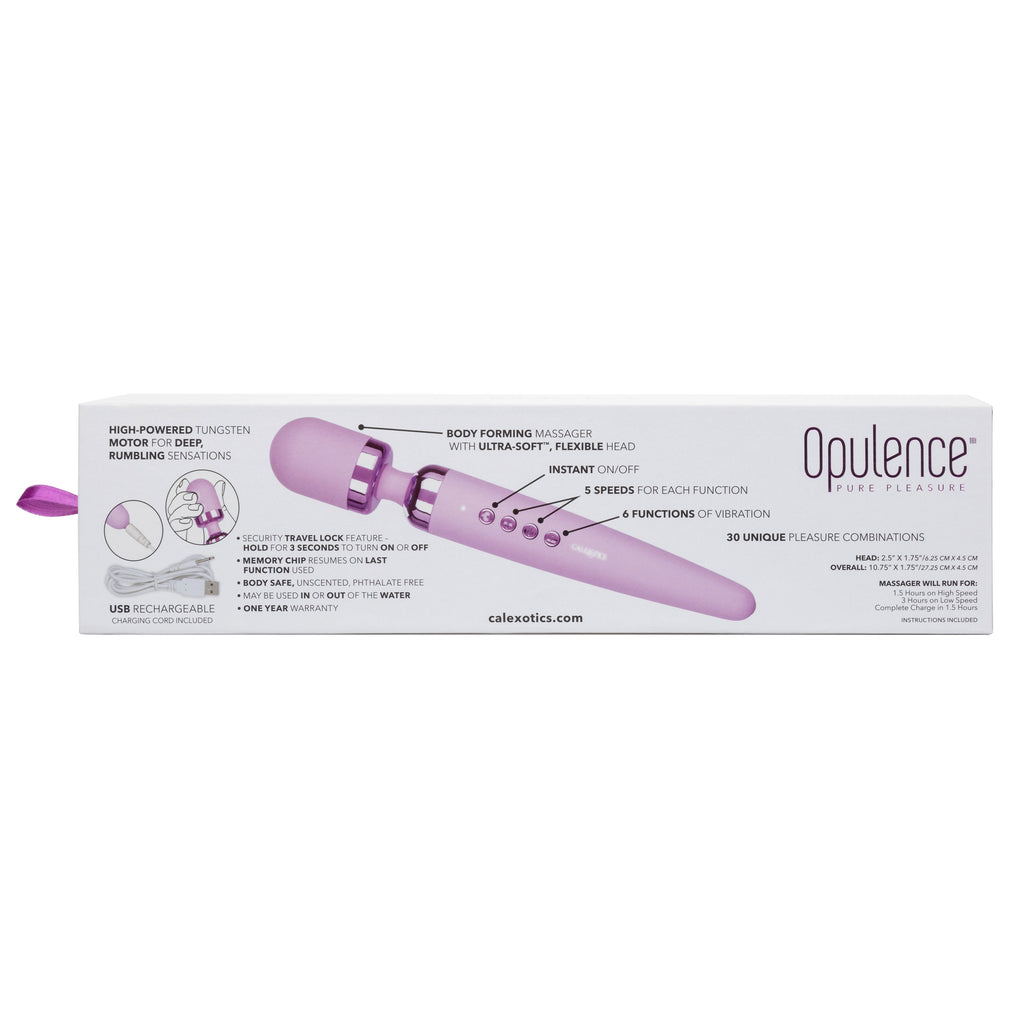 Envelop your most intimate curves in luxurious pleasure with the Opulence Beautiful Body Wand. The flawlessly flexible body wand features an Ultra-Soft body-forming head, flexible head and a high powered Tungsten motor. This wonderful wand is packed with 7 functions of vibration and 5-speeds for each function for a variety of playful pulsations. The high-powered massager is created with a flexible body to let you effortlessly control stimulation. Up the intensity and get playful as the vibrator bends and flexes with your every move. While the flexible wand moves with you, the 6 functions of vibration and 5 independent speeds for each function create one-of-a-kind stimulation. The easy-touch control buttons let you effortlessly flicker through each function of vibration, while increasing or decreasing the function intensity. While you're taking a dip with a lover or indulging in a steamy solo session, look forward to up to 3 hours of waterproof vibration. Recharge pleasure and get back to playtime in only 1.5 hours with the provided USB cable. The hypoallergenic luxury massager is made form Ultra-Soft silicone. High-Powered Tungsten Motor for Deep Rumbling Sensations Body Forming Massager with Ultra-Soft, Flexible Head Instant On/Off Button Speeds for Each Function 6 Functions of Vibration 30 Unique Pleasure Combinations Security Travel Lock Feature Memory Chip Resumes on Last Function Used Body-Safe, Unscented, Phthalate-Free May Be Used In or Out of the Water One Year Warranty USB Rechargeable, Charging Cord Included Massager Will Run For: 1.5 Hours on High Speed 3 Hours on Low Speed Complete Charge in 1.5 Hours Head Measurements: 2.5" x 1.75"/ 6.25cm x 4.5cm