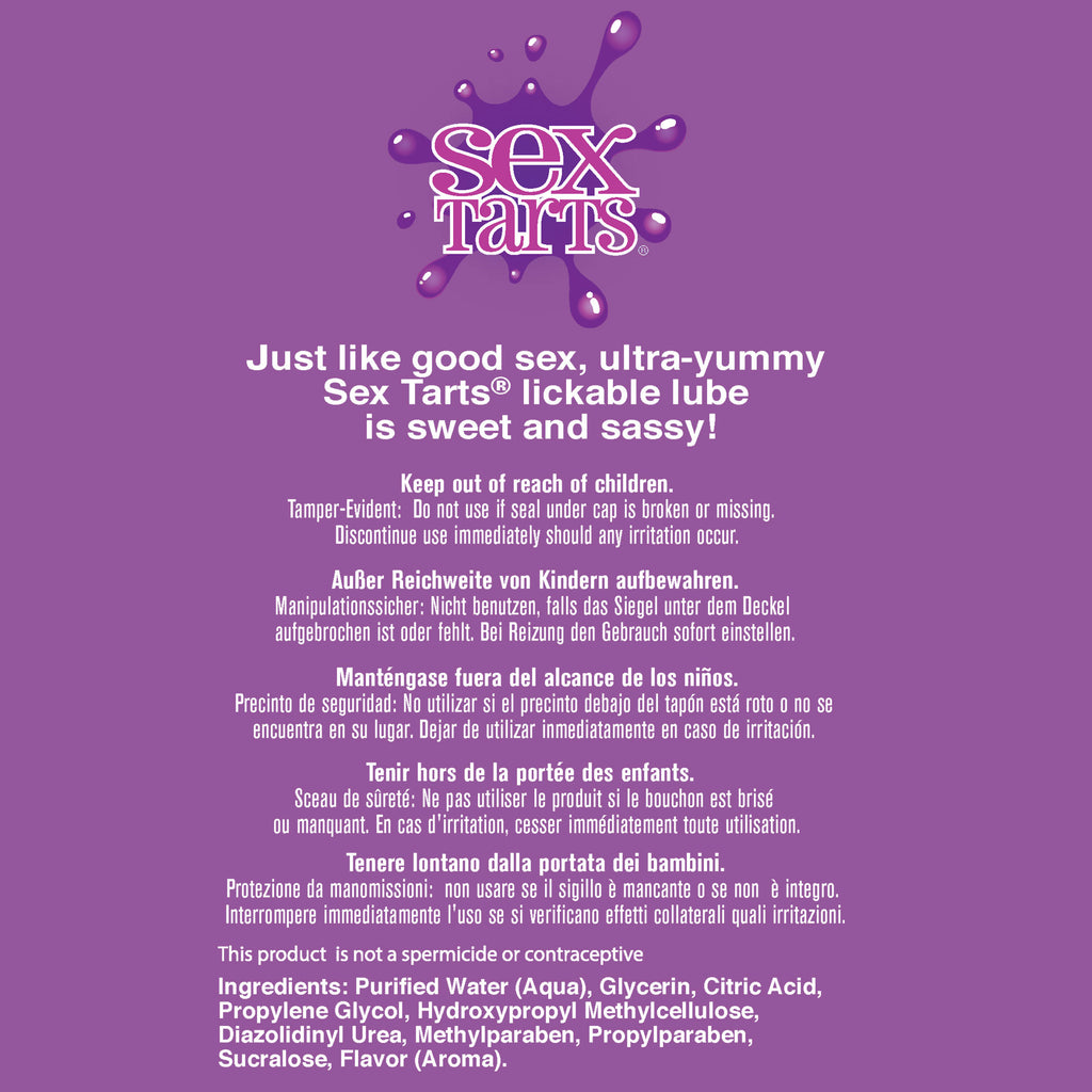 Lickable, kissable, and delicious, Sex Tarts are tangy, fruity, pleasure gels. The water-based formula is non-staining and proudly made in the USA! 59 mL Tube Ingredients: Purified Water (Aqua), Glycerin, Citric Acid, Propylene Glycol, Hydroxypropyl Methylcellulose, Diazolidinyl Urea, Methylparaben, Propylparaben, Sucralose, Ethyl Alcohol, Flavor (Aroma)