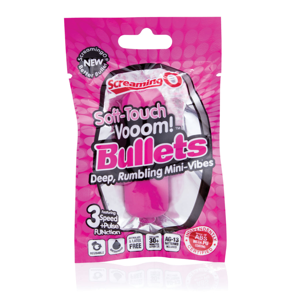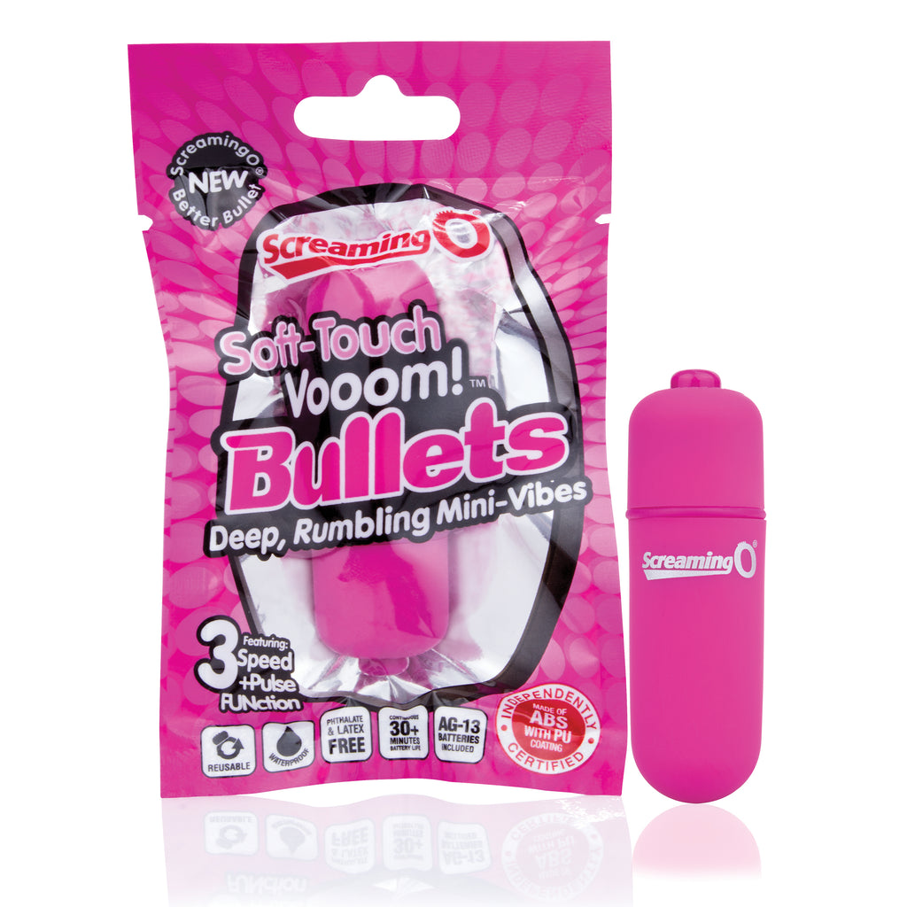 Soft-Touch Vooom Bullets combine the compact shape, 4-function motor, and soft coat of Screaming Os famous Soft-Touch Bullets with a one-of-a-kind low-frequency motor for sensations unlike anything else on the market. Following research into vibration frequency and optimal clitoral massage speeds , Screaming O developed a unique motor that buzzes with deep rumbling vibration you can feel from the inside. And thanks to a 100% waterproof soft-touch shell, users can enjoy smooth, gliding sensations in the bath or shower! These portable mini vibes pack intense power in an on-the-go size thats perfect when larger, bulkier vibes just wont cut it and add essential stimulation for better, more satisfying sex! 100% waterproof 3 speeds plus pulsation Soft-touch coating for smooth sensations Reusable Phthalate & latex free Continuous 30+ minutes of battery life AG-13 Batteries Included