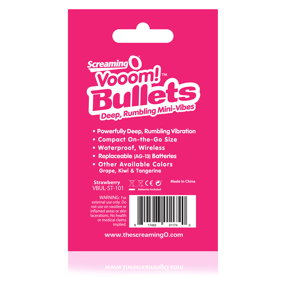 Enjoy powerfully deep sensations in a compact, on-the-go size with Vooom Bullets, the latest mini-vibe innovation from The Screaming O! Featuring a brand new low-frequency motor, Vooom Bullets buzz with a one-of-a-kind rumbling vibration you can feel from the inside and are encased in a 100% waterproof shell, making it easy to enjoy intensely stimulating sensations in the bath or shower! Features: - Mini vibe with new rumbling motor - New motor for deeper vibration sensation - Waterproof