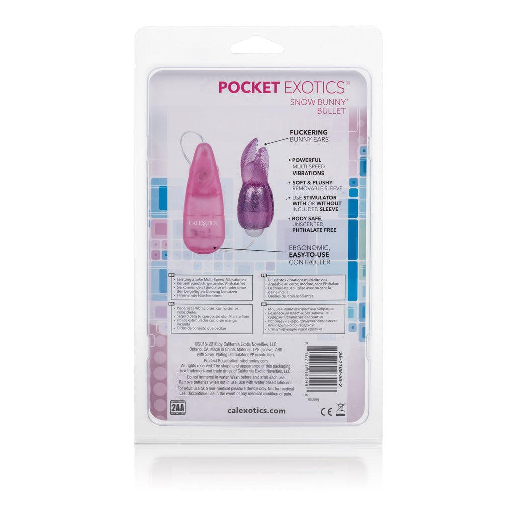 Voted #1 Bunny Arouser. High-intensity vibrating bullet with removable, dual-action bunny teaser. Multi-speed power pack. Use stimulator with or without included sleeve. Body safe, unscented, and phthalate free. TPE (bunny), PP (controller), and ABS with silver plating (bullet).