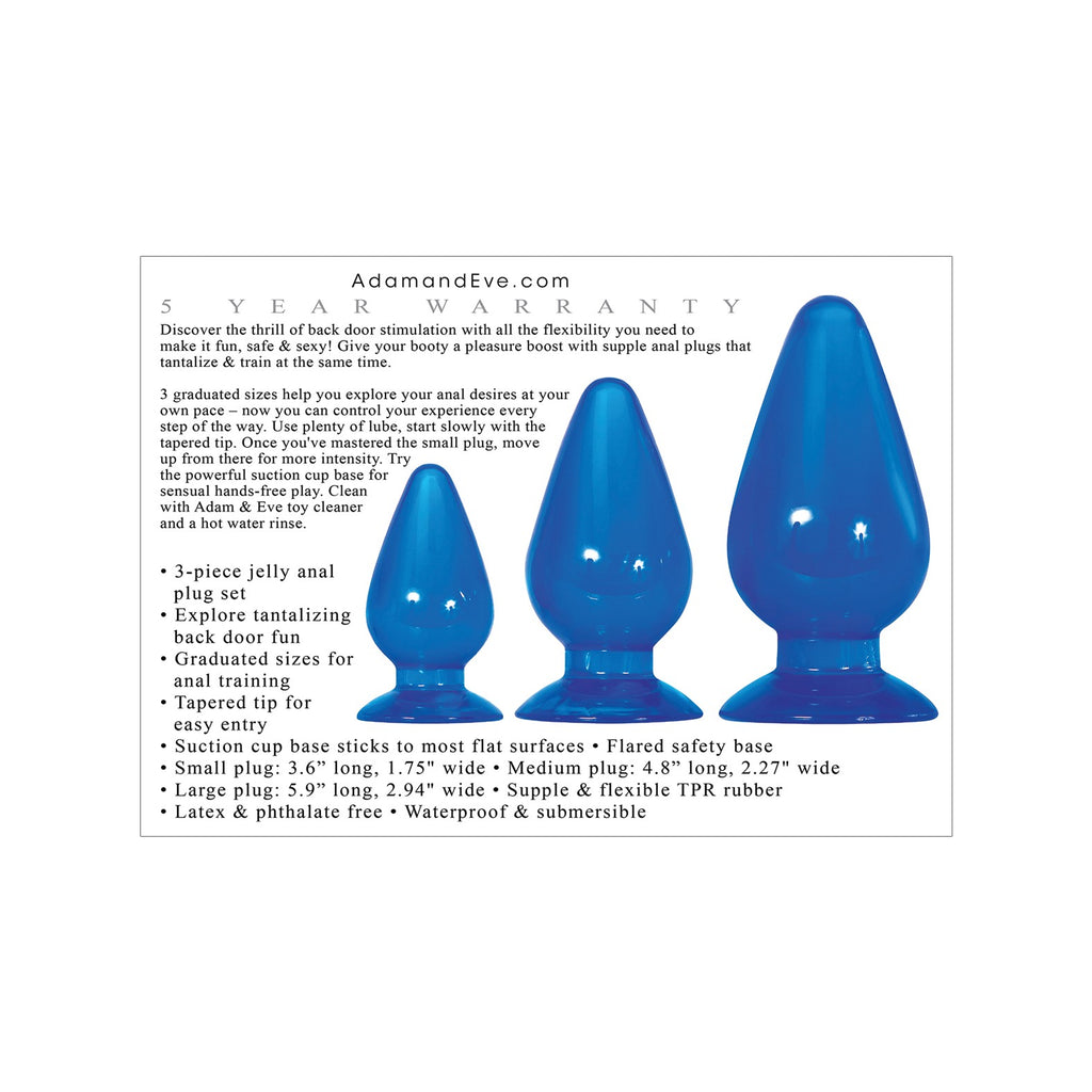 Discover the thrill of back door stimulation with all the flexibility you need to make it fun, safe & sexy! Give your booty a pleasure boost with supple anal plugs that tantalize & train at the same time.3 graduated sizeshelp you explore your anal desires at your own pace -now you can control your experience every step of the way. Use plenty of lube, start slowly with the tapered tip. Once you've mastered the small plug, move up from there for more intensity. Try the powerful suction cup base for sensual hands-free play.