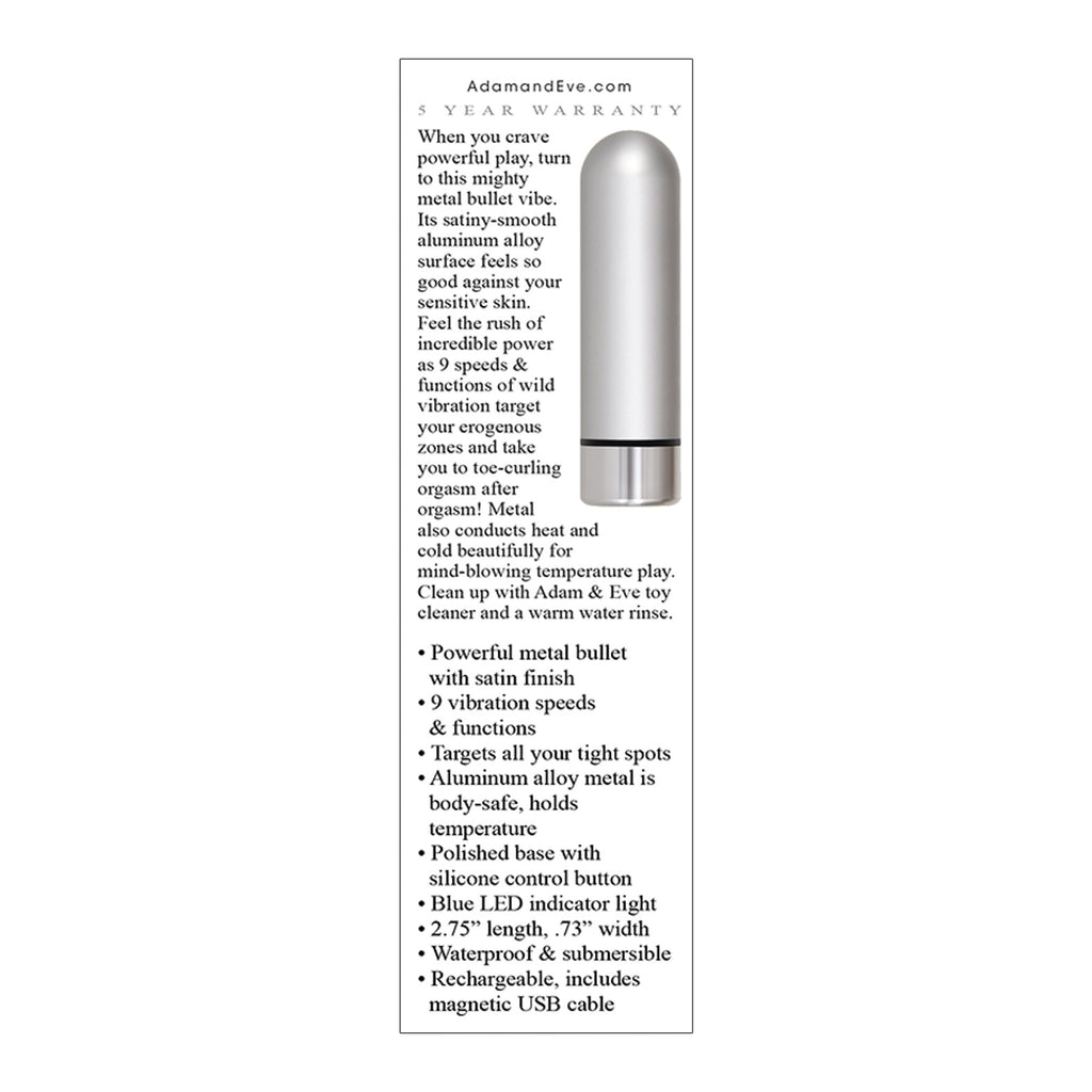Its satiny-smooth aluminum alloy surface feels so good against your sensitive skin. Feel the rush of incredible power as 9 speeds & functions of wild vibration target your erogenous zones and take you to toe-curling orgasm after orgasm! Metal also conducts heat and cold beautifully for mind-blowing temperature play.