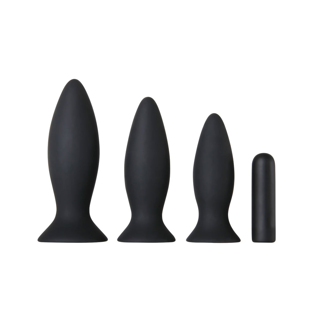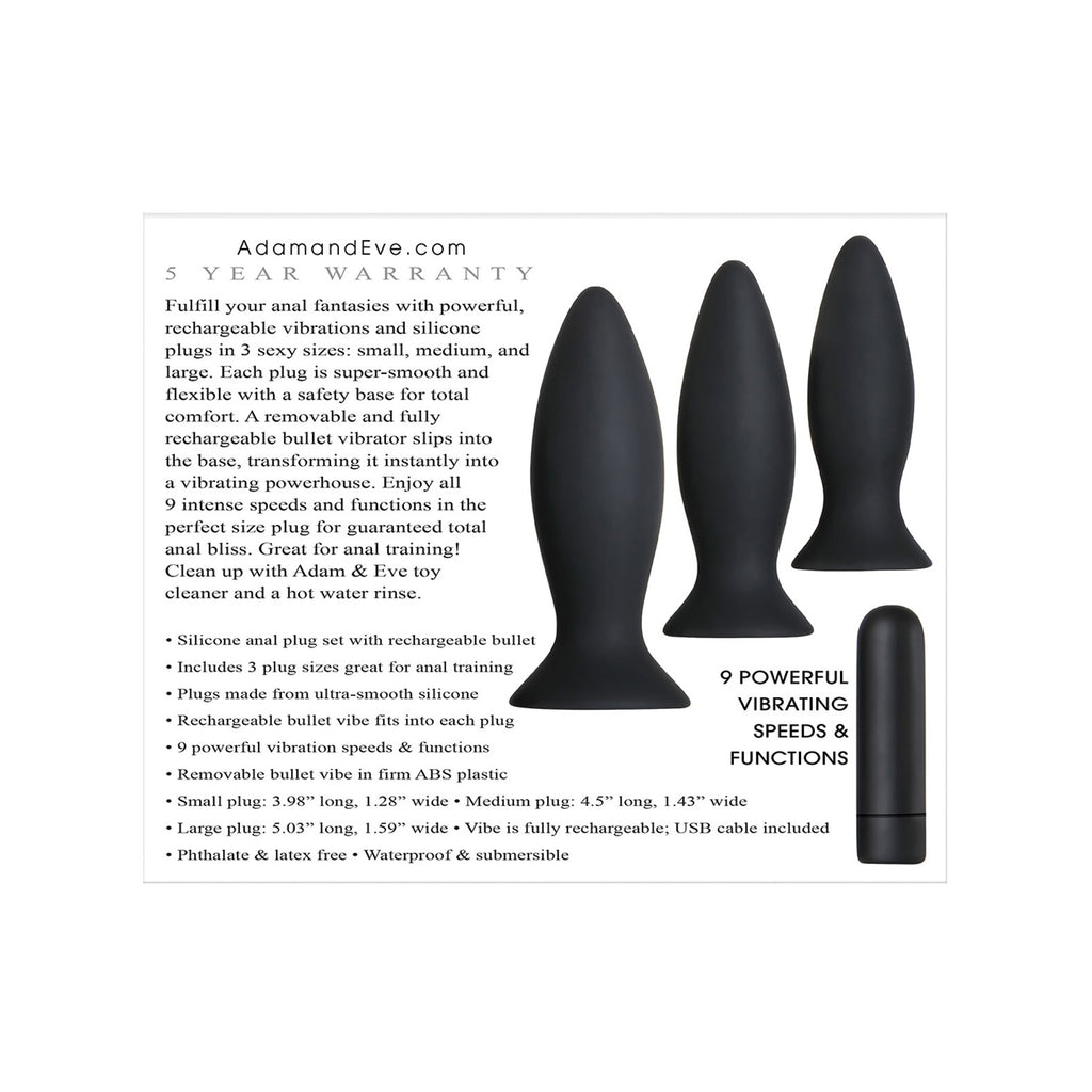 Fulfill your anal fantasies with powerful rechargeable vibrations and plugs in 3 sexy sizes. Each plug is super-smooth and flexible with a safety base for comfort. A removable and fully rechargeable bullet slips into the base. Enjoy all 9 intense speeds and functions in the perfect size plug for all. Great for anal training. Waterproof and fully submersible. Material: Silicone USB rechargeable, cable included. Dimensions: Small plug- 4 inches long by 1.25 inches wide. Medium plug- 4.5 inches long by 1.5 inches wide. Large plug- 5 inches long by 1.60 inches wide. Five year warranty.