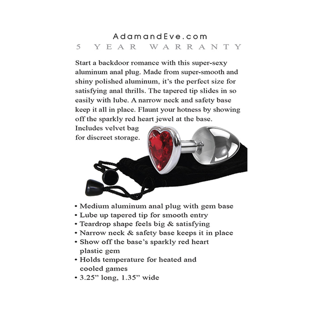 Fall in love with anal play! This gleaming metal anal plug is sized for sweet pleasure that even beginners will love. Add lube and enjoy the easy glide in and stimulating feel. The red heart jeweled base makes insertion easy, keeps the plug in place, and lets you show off your cheeky side. The metal even holds temperature for thrilling warm or cold play. Includes a velvet bag for easy storage. 3.25” long, 1.35” wide,