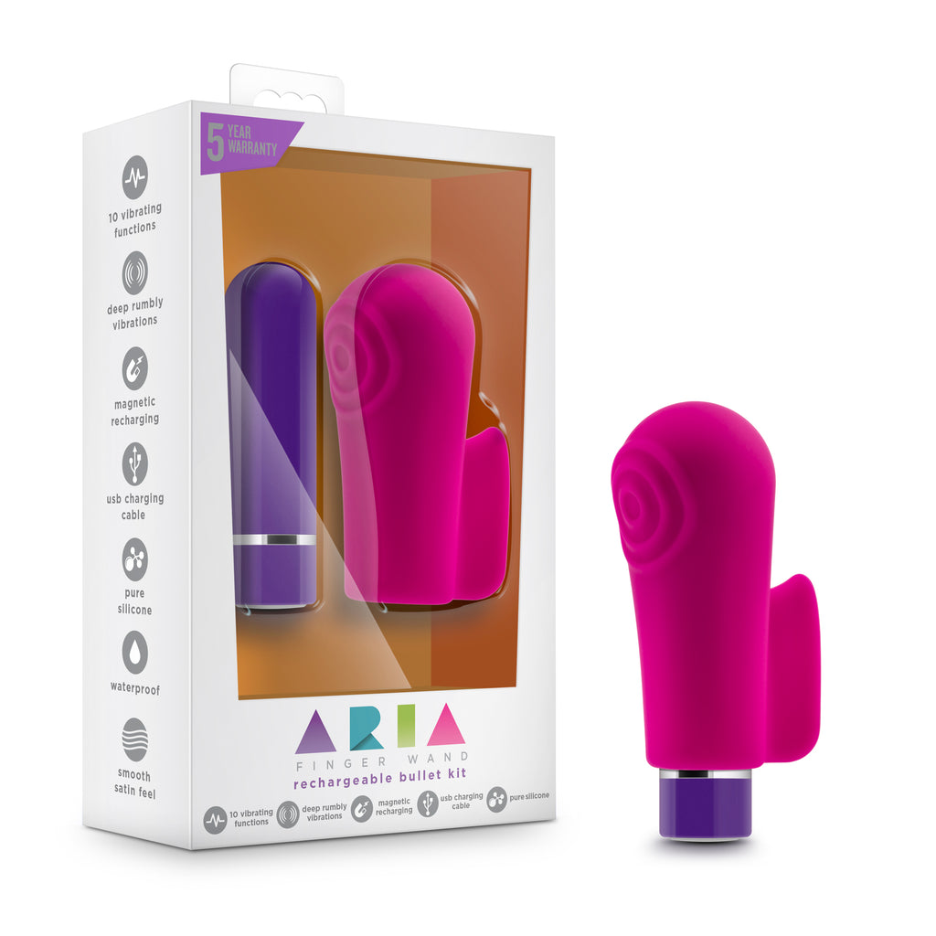 Turn you finger into a magic wand with The Aria Finger wand in fuchsia. It is the perfect traveling bullet that can be used alone or with a partner. The Aria Finger Wand is compact, measuring just under 3 inches, but what it lacks in size, it makes up in power. It features 10 vibrating functions: 5 speed settings and 5 unique vibrating patters. It's deep rumbly vibrations deliver an unforgetable experience. When fully charges, you can get a full hour of play. Ergonomically designed to fit your hand and your body. The bullseye tip is the center of pleasure and it can be used on pleasure points such as your clit, nipples, or perineum. The tip of the Finger Wand can be used internally and can pinpoint all of your erogenous zones. Waterproof and body safe. Includes USB charging cable.