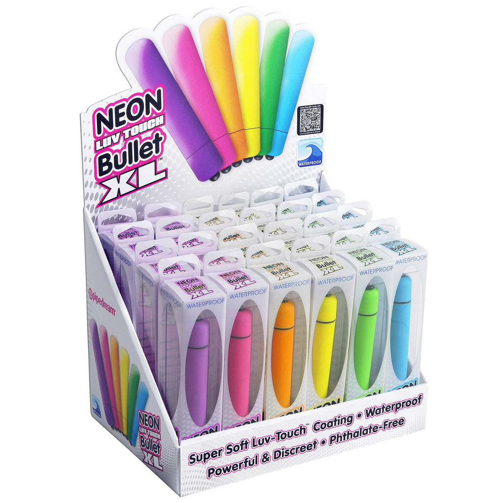 Neon Luv Touch Bullet Xl Vibrator 24 Piece Display. You Will Glow With Pleasure From This Radiant. Neon Luv-Touch Bullet! Lined With Our Super-Soft Luv Touch Material, This Vibrant Bullet Is Smooth To The Touch, Satisfying And Ultra Sleek. Push The One-Touch Control And Let The Silent Vibrations Whisk You Away. Try It In The Shower Or Hot Tub And Turn Bath Time Into Passion Play! Neon Luv Touch Xl Bullet Vibrator Features And Functions Luv Touch, Phthalate Free, Non-Toxic Materials Abs Plastic With Polyurethane Pu Coating. Waterproof Vibrations For Play Outside The Bedroom. Discreet Operation. Battery Operated Vibrating Sex Toy Requires 1 Aaa Battery, Not Included. Vibrator Measures 3.25 Inches Long By .75 Inch Wide. Girth 2 Inches Around. Display Package 5.75 Inches Deep By 8.25 Inches Wide By 6.5 Inches High. Packaged Weight 2 Pounds. Display Cardboard Point Of Purchase Box With Colorful Header. Country Of Origin China. Harmonized Tariff Schedule Hts Code 9019102000. Package Dimensions: Depth 5.75 Inches, Width 8.25 Inches, Height 6.50 Inches. Packaged Weight 2.00 Pounds. Package Type Display Box. New Images Added January 15, 2013.