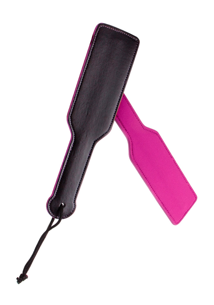 This Paddle is designed with a PU leather and a neoprene side, this allows you to choose the material you will feel on your skin by simply turning the paddle around. The Neoprene side is colored and the PU leather side is black for a rougher look! It features an wristband on the end of the paddle for your wrist to ensure it will stay in your hand during use and the combination of materials makes it perfect for beginners and the more professional bondage players!