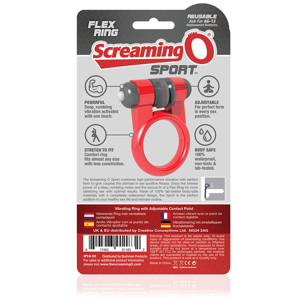 This box contains 6 RED Screaming O Sport C-rings. The Screaming O Sport combines high-performance vibration with perfect form to give couples the ultimate in sex-positive fitness. Enjoy the intense power of a deep, rumbling motor and the secure fit of a Flex Ring for more satisfying sex with optimal results. Made of 100% lab-tested body-safe materials with a completely waterproof design, the Sport is the perfect addition to your healthy sex life and intimate routine. Features: - Super-flex vibrating ring for sex-positive fitness - Rotating bullet adjusts for perfect form in every sex position - High performance motor rumbles for deeper results - Stretchy SEBS material fits most sizes with less constriction - Waterproof