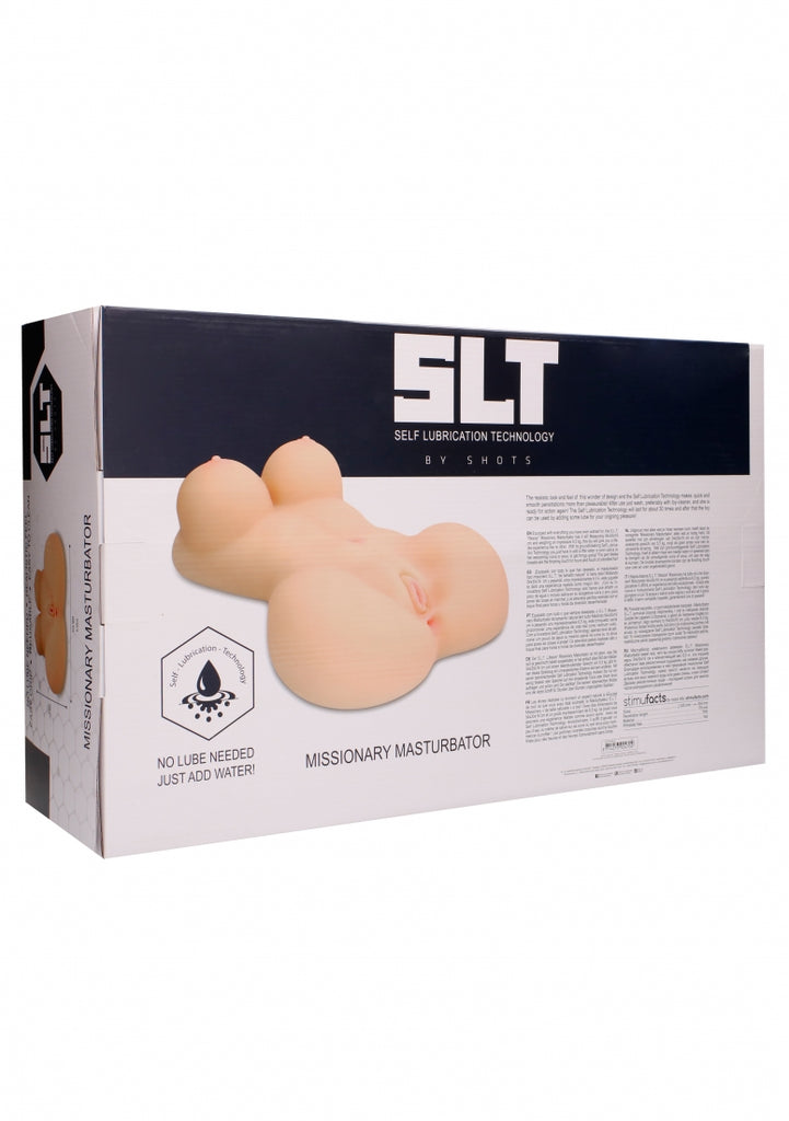 Equipped with everything you have ever wished for, the S.L.T. "lifesize" Missionary Masturbator has it all! Measuring 58x32x16 cm and weighing an impressive 6kg, this toy will give you a lifelike experience like no other. With its groundbreaking Self Lubrication Technology you just have to add a little water or even saliva on her welcoming vulva or anus, to get things going! The pert lifelike breasts are the finishing touch for hours and hours of unbridled fun!