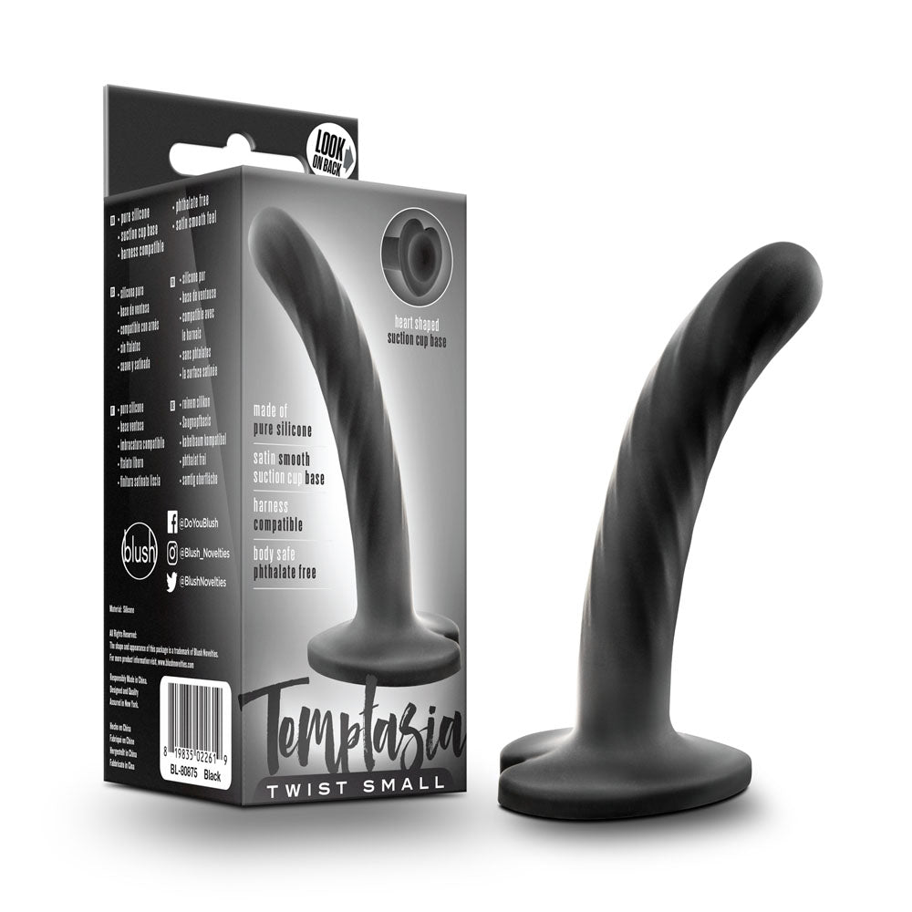 The Temptasia Twist Small delivers swirling texture that's perfect for gentle G-spot or anal stimulation! Its cute heart-shaped base includes a strong suction cup and is harness compatible. Either solo or with your partner, the Temptasia Twist is a fun, stylish addition to your playtime. The Twist Small's 0.75 inch width and 3.75 inch insertable length make it an excellent choice for the new dildo user, or for anyone who enjoys short, slim toys. With a satin smooth silicone finish, this dildo is made for comfort. Its 100% platinum cured silicone is body safe and easy to clean: just boil for 5 minutes to fully sanitize or wash with mild soap and water during everyday use. Insertable Length 4"