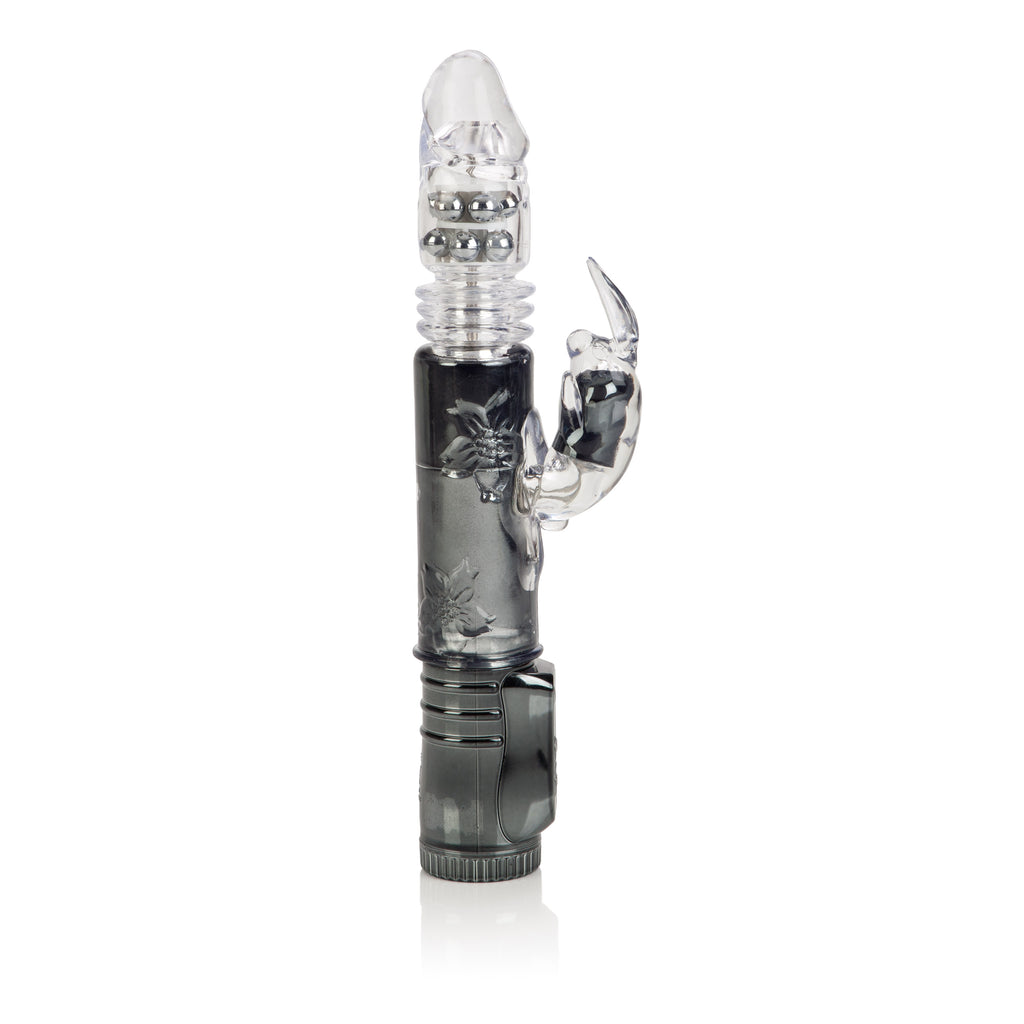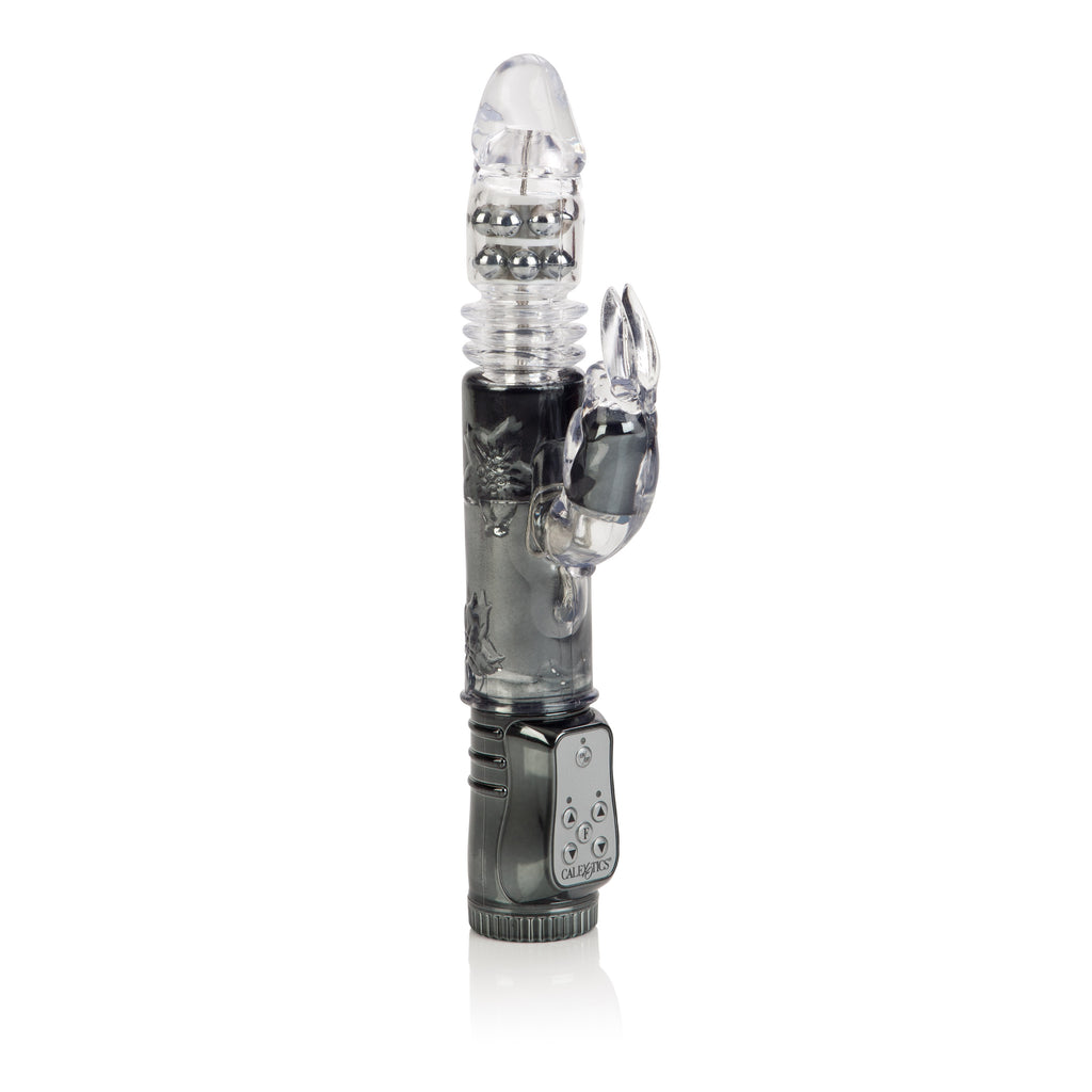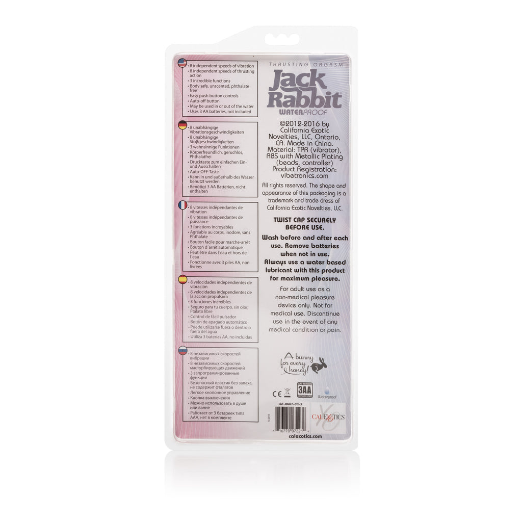 Thrust into a toy that's made to satisfy your every desire with the Thrusting Orgasm Jack Rabbit. This elaborate toy has functions to realize your every craving with incredible textures, speeds, rotations, and plenty of ways to play. This bunny featues dual motors - one in the shaft and one in the bunny teaser - to tickle your clit and tantalize your g-spot all at once. The Thrusting Orgasm Jack Rabbit has eight independent speeds of vibration and thrusting action to hit all the right spots in exactly the way that sends you shooting to earth shattering orgasms. Features & Benefits: Multiple rows of non-jamming pleasure beads. An instant on/off button means you can turn on with ease.. and turn off when you're fully satiated. An LED indicator light shows you the way to pure pleasure. The soft glow will lead you to the peak of satiating pleasure. For the ultimate in gratification, independent controls all you to choose from any of the 8 speeds of vibration and 8 speeds of thrusting action. Shaft measures 5.25" x 1.5" (13.25 cm x 2.5 cm) Bunny measures 2.5" x 1" (6.25 cm x 2.5 cm) Three AA batteries are required to let this bunny transport you to a place of incredible ecstasy. Not included.