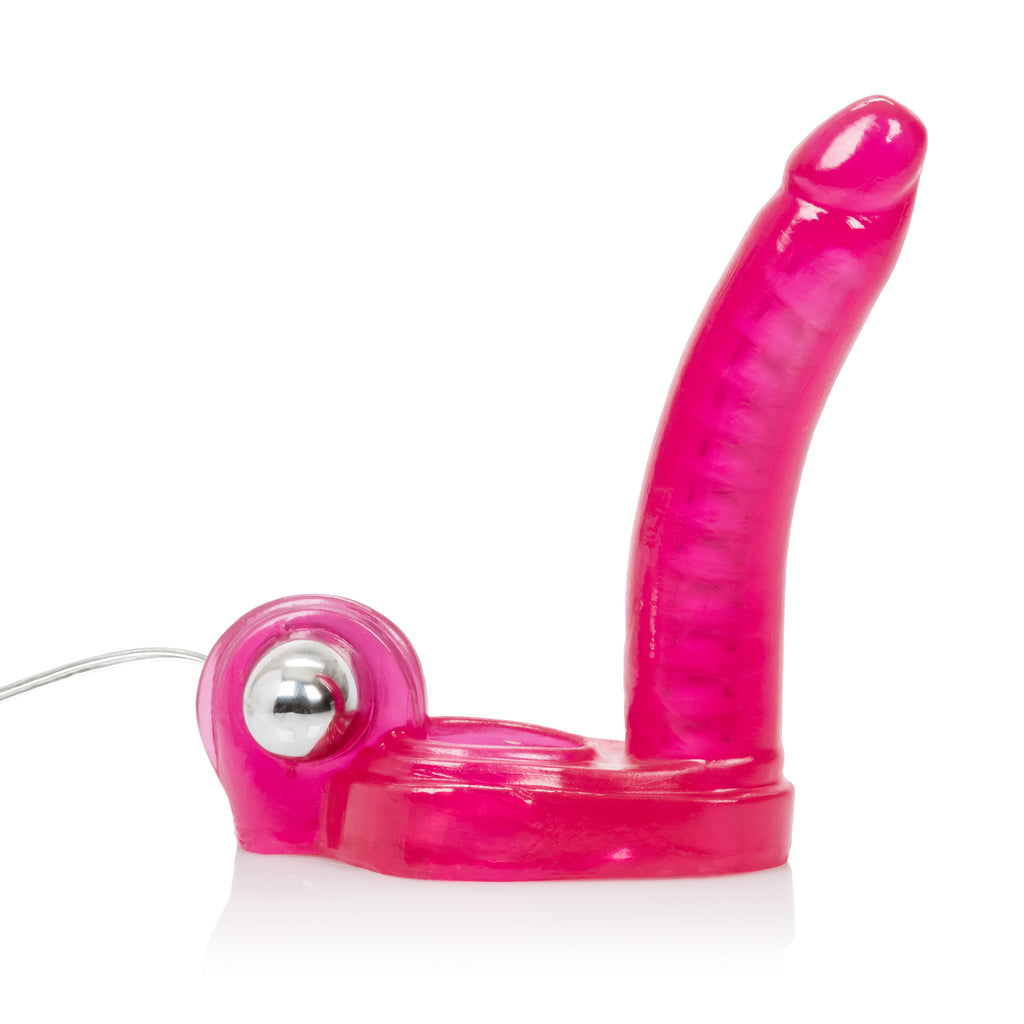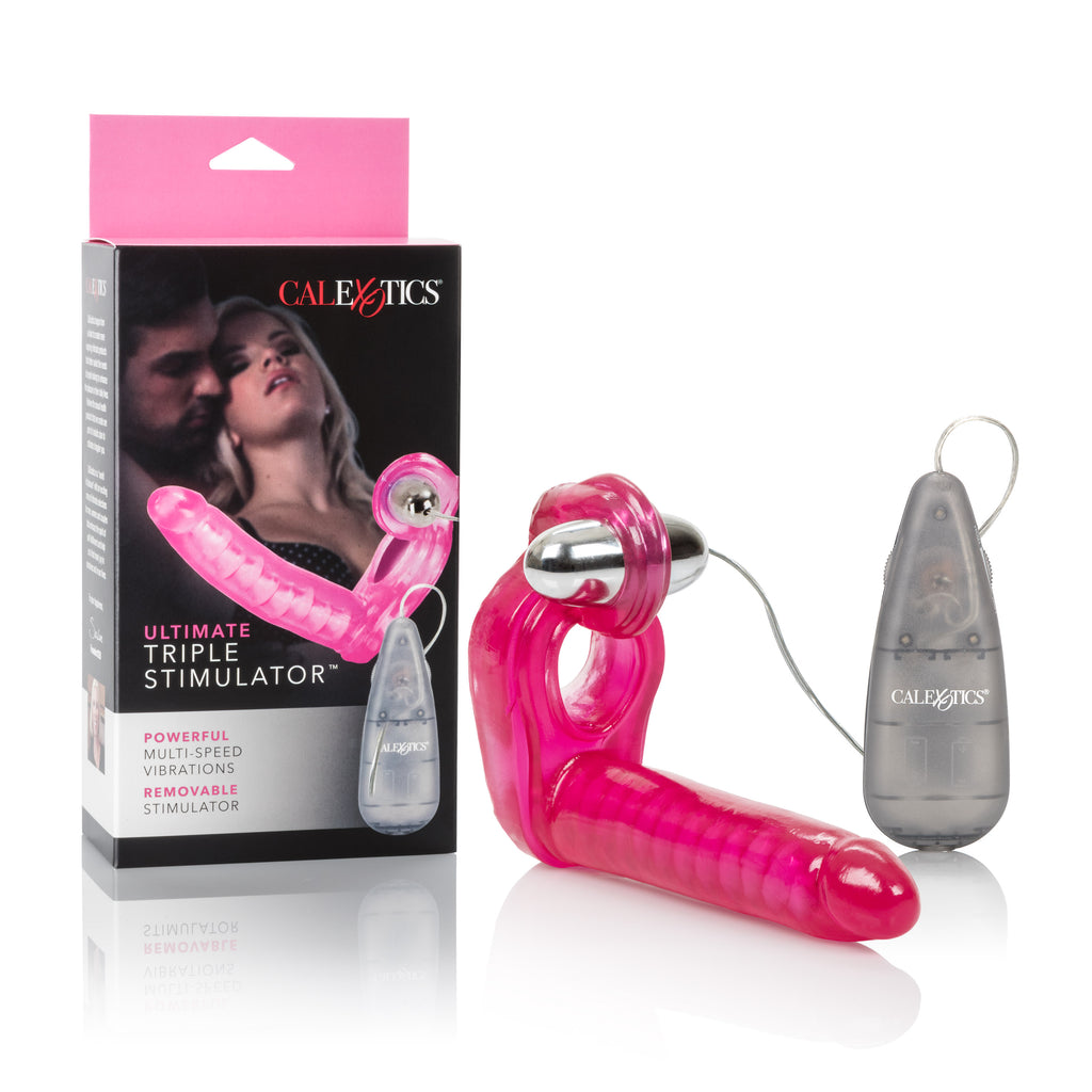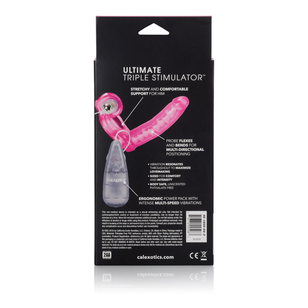 Increase and maximize your intimate pleasure with the Ultimate Triple Stimulator. The erotic and exotic couples enhancer delivers intensely satisfying ecstasy for him and her. The supportive penis ring boasts triple contact action that stimulates your every desire. Enjoy the ultimate DP experience without inviting a new friend to join in! The easy to use set comprises of a sturdy and soft, unscented phthalate free PVC support ring with a contoured clitoral teaser, and an attached flexible vertebrae dong. The arouser simultaneously delivers intensely pleasurable clitoral stimulation thrills and an orgasmic double penetration experience. The enhancer also includes a vibrating multi-speed bullet, with cord attached power pack. The stimulator provides optimal stamina support for enhanced erection maintenance and a rock hard performance every time. The flexible sensually textured penis shaped dong maximizes and doubles the pleasure for a heightened amorous encounter. The removable bullet can also be used to arouse and stimulate red-hot erogenous zones and super sensitive sweet spots all over the body. To increase the satisfaction even further, always use a quality lube with this toy. Requires 2AA (Not Included)