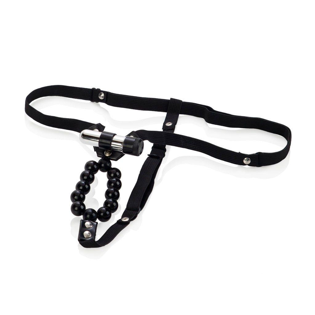 Take your lovemaking to a whole new level with the super sexy, all-embracing Vibrating Lover's Thong with Stroker Beads. This unique and advanced massage product designed to give him and her increased pleasure during life's most romantic moments. Get intimate with your partner, knowing that you have a fun, flirty an exciting new accessory that can turn up the heat for the both of you, providing intense and sensual massage on contact. Designed for mutual stimulation, the pleasure beads give him intense massage while the wireless, removable micro stimulator provide deep pulsations for her. The G-string thong is fully adjustable so you can get the perfect fit and achieve the right level of tension. The silver plated, high quality bullet is easy to operate and it can be removed from the thong for independent use anywhere on the body. The beaded thong and bullet are both easy to clean after each use and can be packed in your purse, handbag, or luggage for romantic nights away. Measurements: Bullet: 2" x 0.5" / 5cm x 1cm Panty Circumference: 38.5" / 98cm Materials: ABS plastic and Nylon