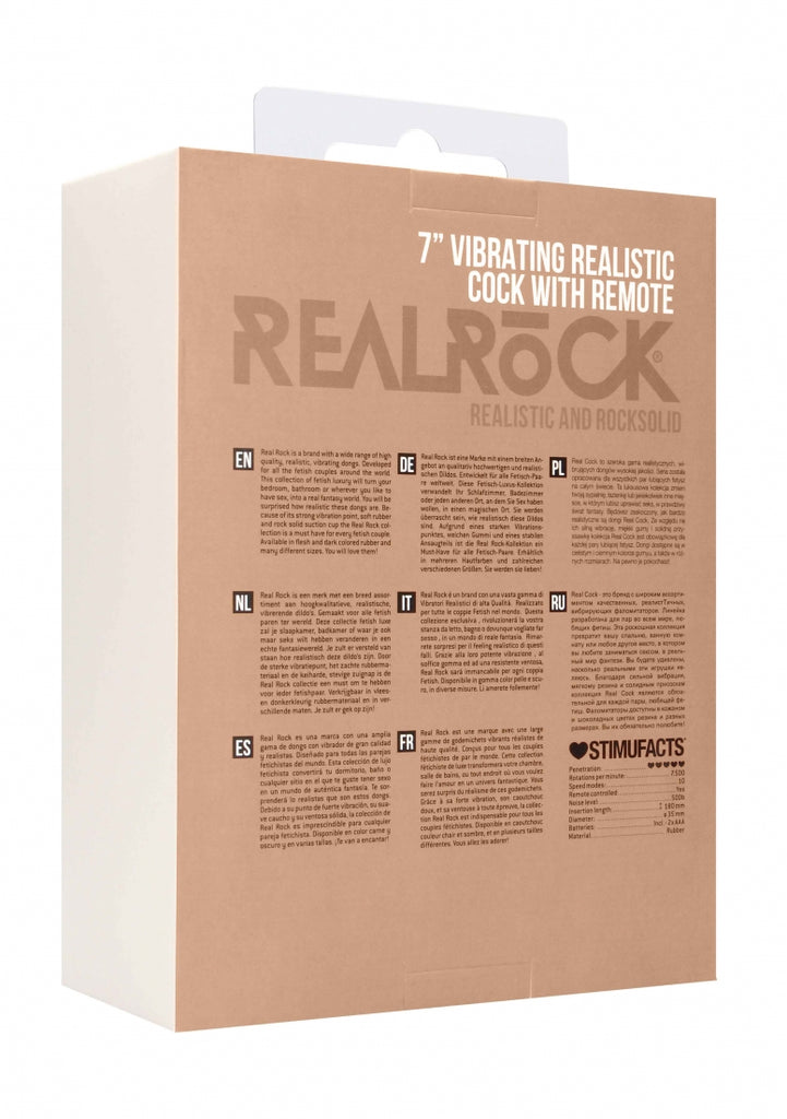 Enjoy the high quality 7 inch vibrating realistic cock, designed with a realistic head as a strong vibration point, veins for extra stimulation and scrotum for the realistic feel. You will be surprised how realistic this dong is! The rock solid suction cup stick to nearly any surface for a good time in your bedroom, bathroom or wherever you like to have sex. So turn your favourite spot into a RealRock fantasy world! Insert the batteries we provide with the toy and take control for the most intense orgasm you've ever imagined! All dongs by RealRock are made of rubber, are available in skin and black and because of its beautiful packaging its a must have for every dong lover and every store all over the world!