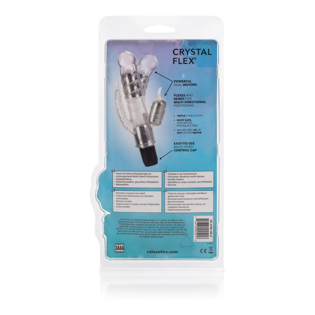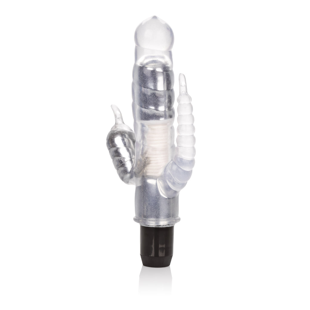 Crystal clear soft Jelly vibrator has tri-point stimulation. Shaft flexes to move with you